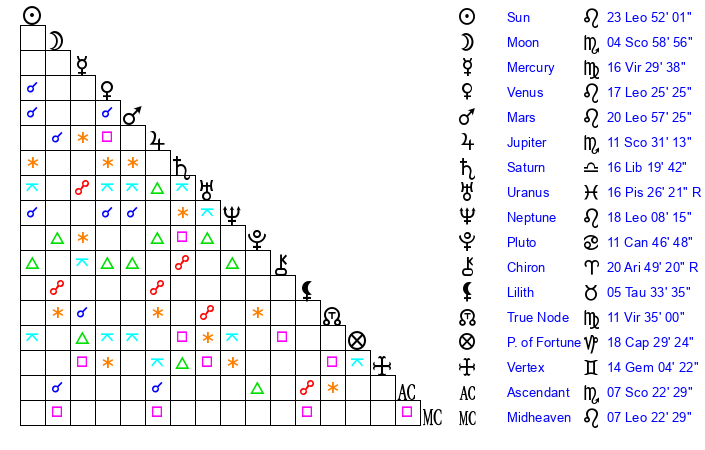 | Neptune | 18 Leo 8 | 1 Aries 40 | 20 Leo 22 |