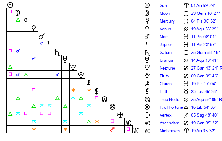| Venus | 19 Aquarius 36 | 2 Aries 15 | 1 Cancer 11 |