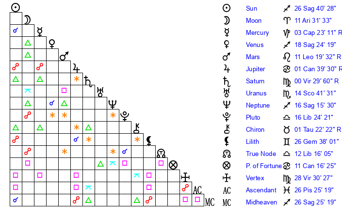 | Sun | 26 Sagittarius 40 | 27 Sagittarius 1 | 15 Aquarius 32 |