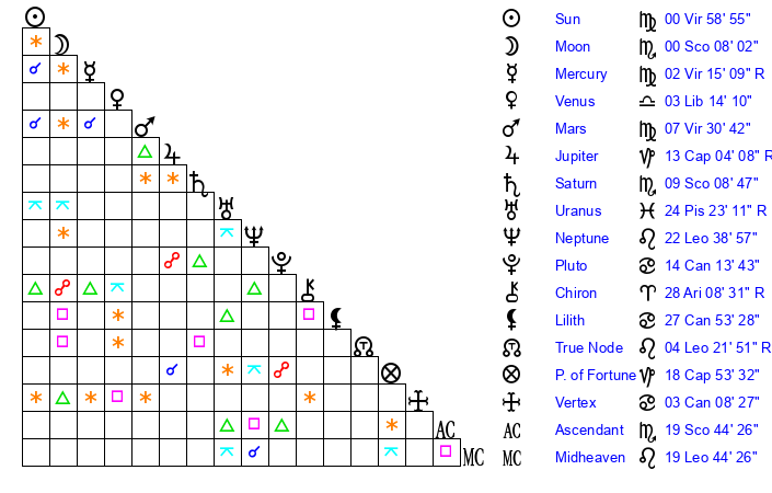 | Moon | 0 Scorpio 9 | 18 Virgo 54 | 6 Cancer 55 |