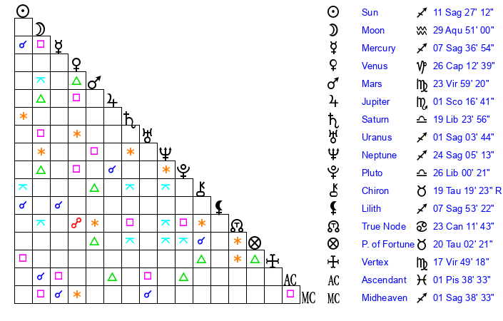 | Sun | 11 Sagittarius 27 | 11 Sagittarius 47 | 26 Capricorn 15 |