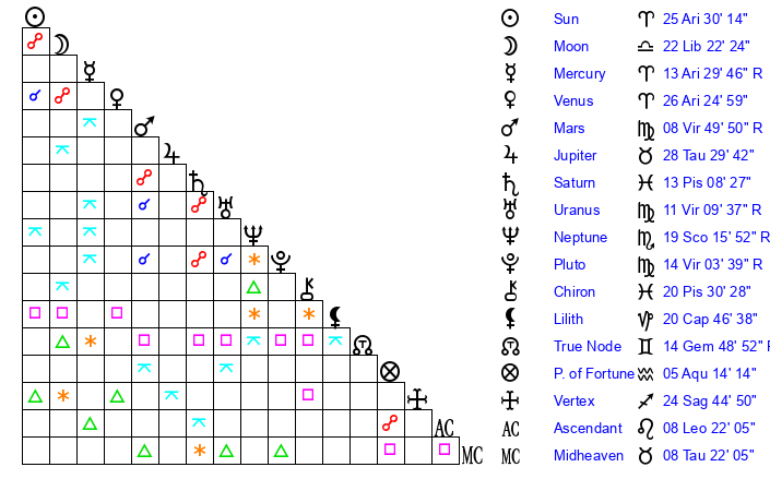 Sun | 25 Aries 31 | 25 Aries 58 | 23 Gemini 24 |