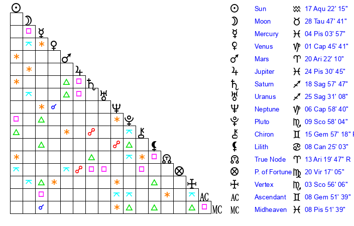 | Saturn | 19 Sagittarius 9 | 17 Pisces 59 | 21 Sagittarius 10 |