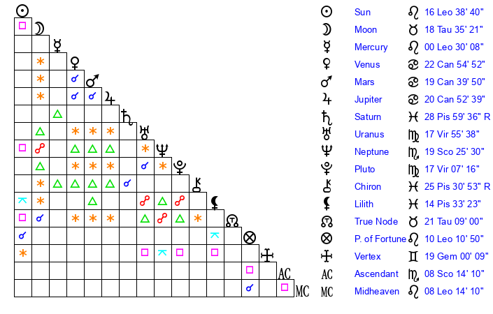 Moon | 18 Taurus 27 | 22 Aquarius 9 | 15 Cancer 52 |