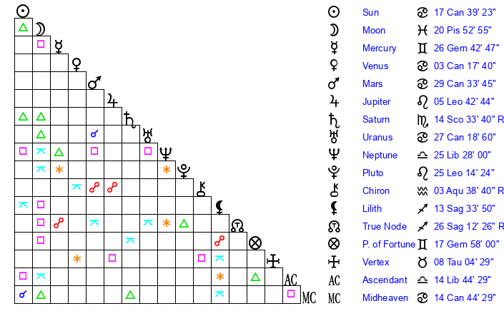 | Moon | 20 Pisces 48 | 16 Capricorn 59 | 24 Libra 36 |