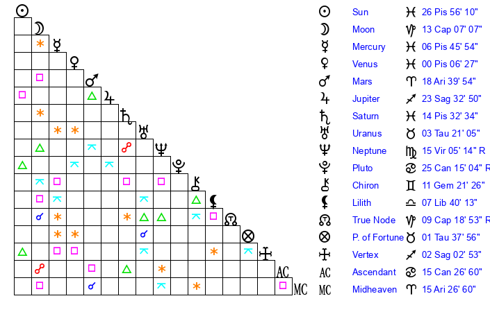 | Sun | 26 Pisces 56 | 27 Pisces 21 | 23 Gemini 25 |