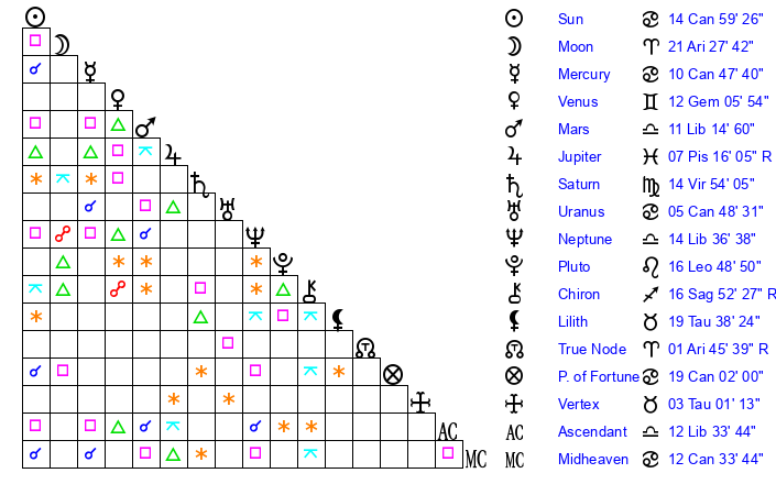 | Neptune | 14 Libra 36 | 2 Aries 10 | 16 Libra 21 |