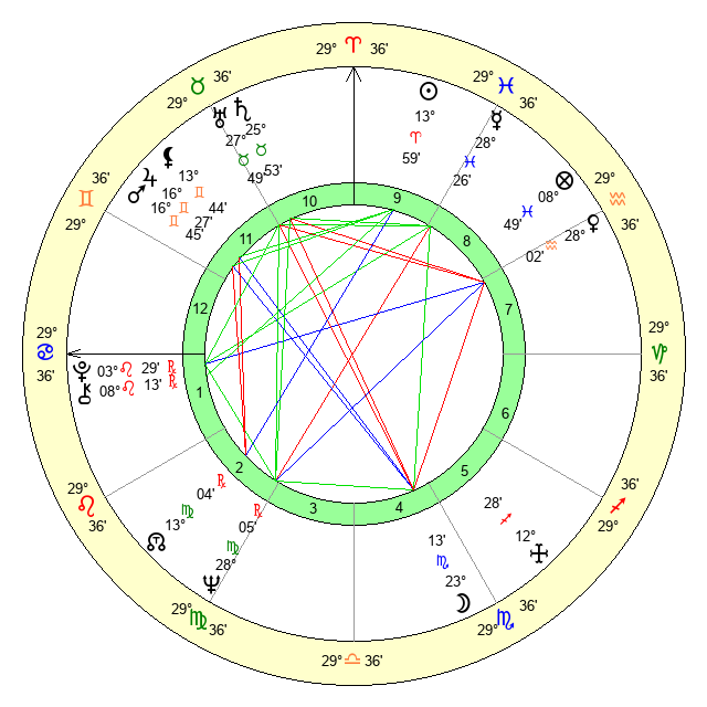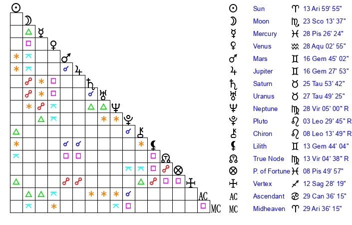 | Sun | 14 Aries 3 | 14 Aries 56 | 4 Cancer 12 |