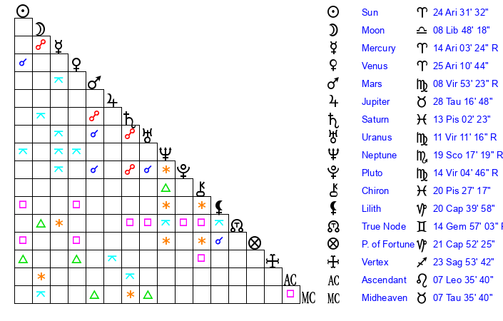 Sun | 24 Aries 32 | 25 Aries 0 | 22 Gemini 27 |