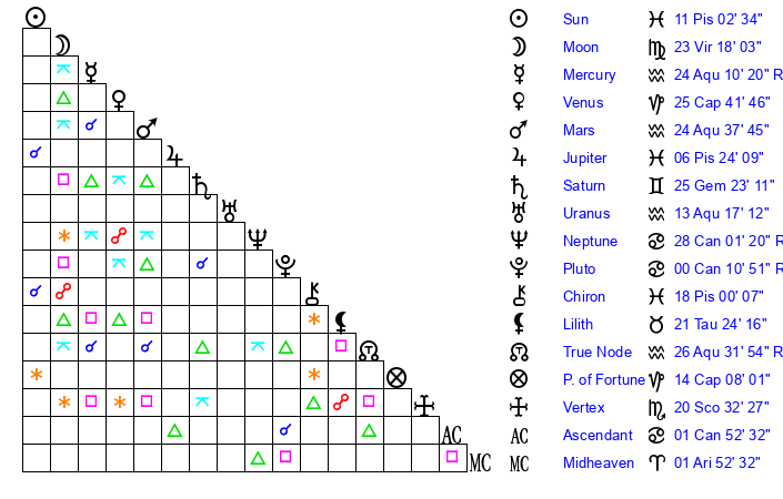 | Sun | 11 Pisces 2 | 12 Pisces 22 | 28 Gemini 16 |