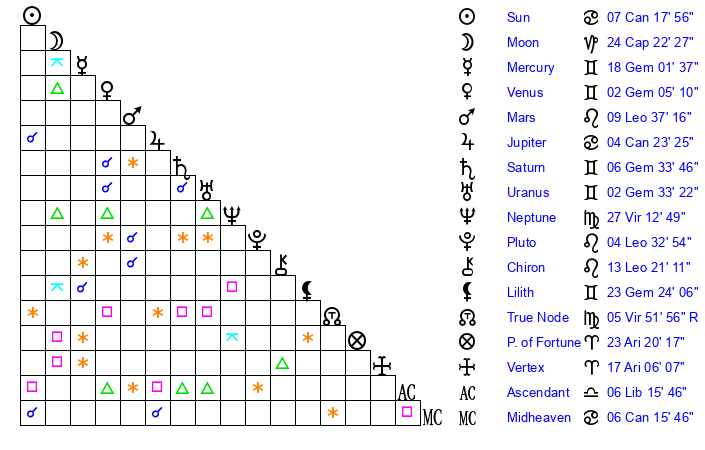 | Moon | 24 Capricorn 19 | 2 Virgo 54 | 6 Aquarius 46 |