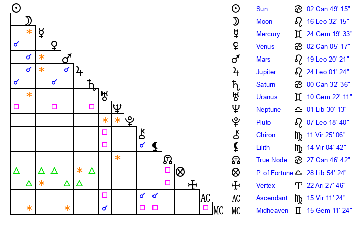 Sun | 2 Cancer 49 | 3 Cancer 14 | 20 Virgo 34 |