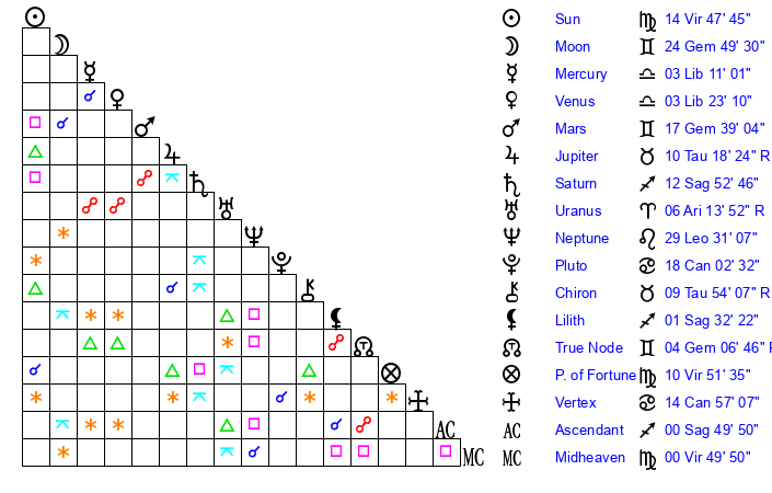 | Sun | 14 Virgo 48 | 15 Virgo 19 | 21 Sagittarius 28 |