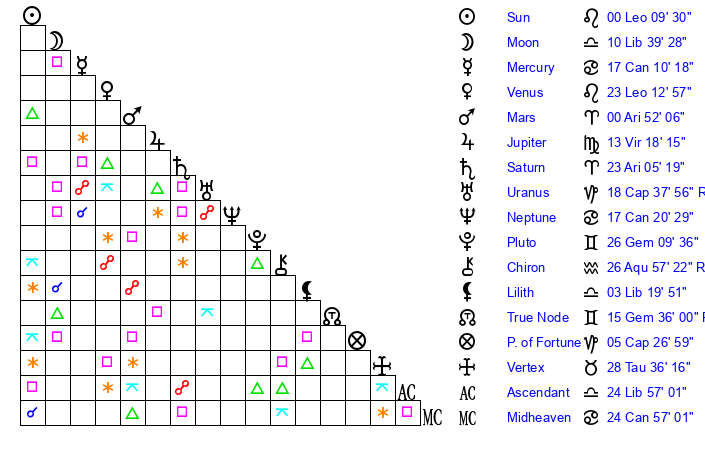 | Moon | 10 Libra 43 | 16 Cancer 48 | 4 Capricorn 43 |