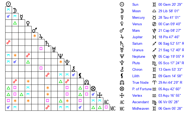 | Uranus | 21 Sagittarius 13 | 27 Taurus 32 | 19 Sagittarius 40 |