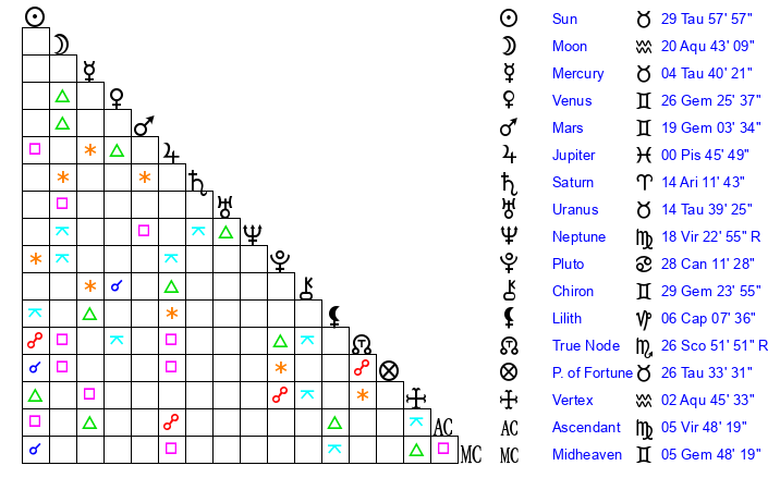 | Moon | 20 Aquarius 30 | 16 Pisces 12 | 26 Aries 25 |