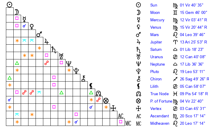 | Venus | 15 Virgo 20 | 0 Leo 1 | 28 Virgo 0 |