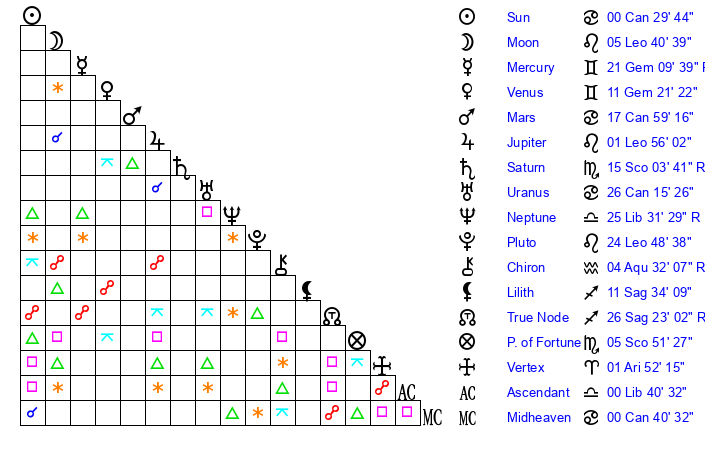 | Sun | 0 Cancer 29 | 1 Cancer 31 | 7 Virgo 30 |