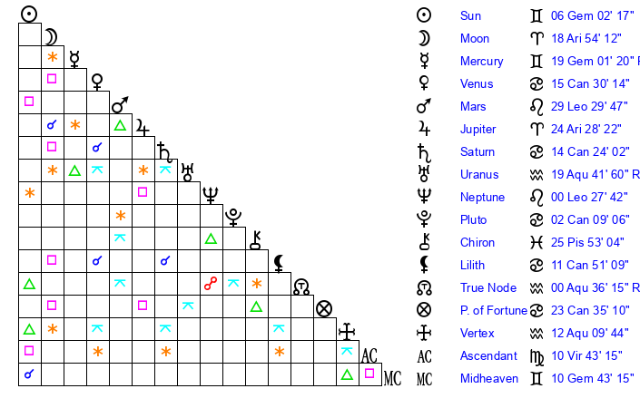 | Moon | 18 Aries 49 | 14 Gemini 53 | 15 Aries 7 |