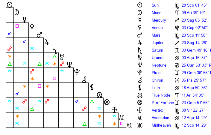 Sun | 28 Scorpio 2 | 28 Scorpio 52 | 21 Pisces 31 |