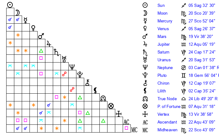 | Sun | 5 Sagittarius 32 | 6 Sagittarius 43 | 9 Aries 48 |
