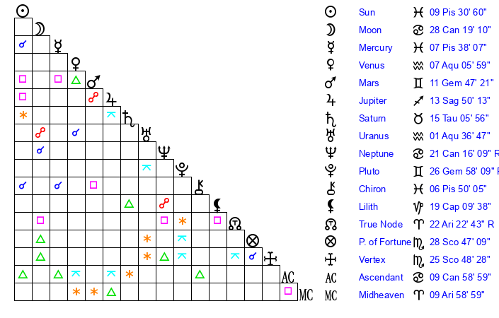 Sun | 9 Pisces 31 | 11 Pisces 6 | 29 Gemini 40 |