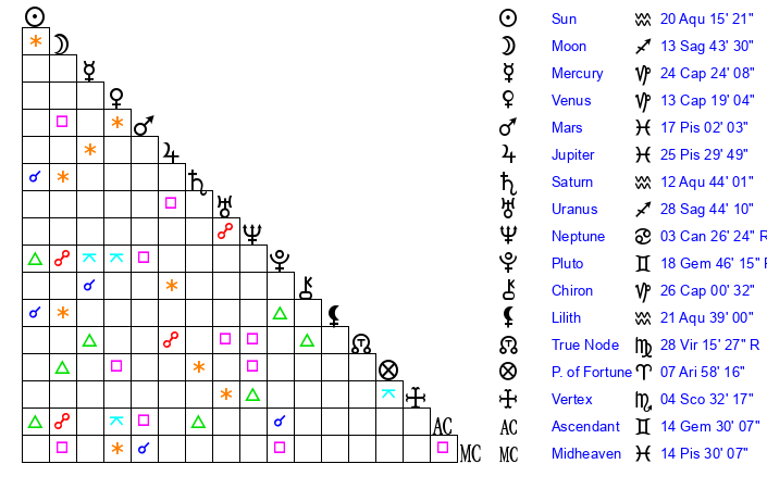 | Sun | 20 Aquarius 15 | 21 Aquarius 55 | 19 Gemini 4 |