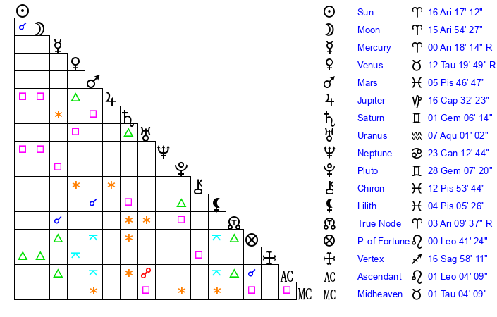 Sun | 16 Aries 17 | 17 Aries 8 | 4 Leo 1 |