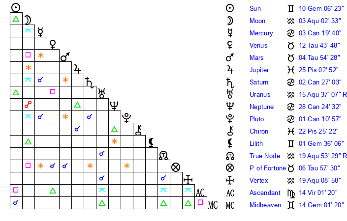 | Uranus | 15 Aquarius 34 | 28 Taurus 10 | 12 Aquarius 7 |