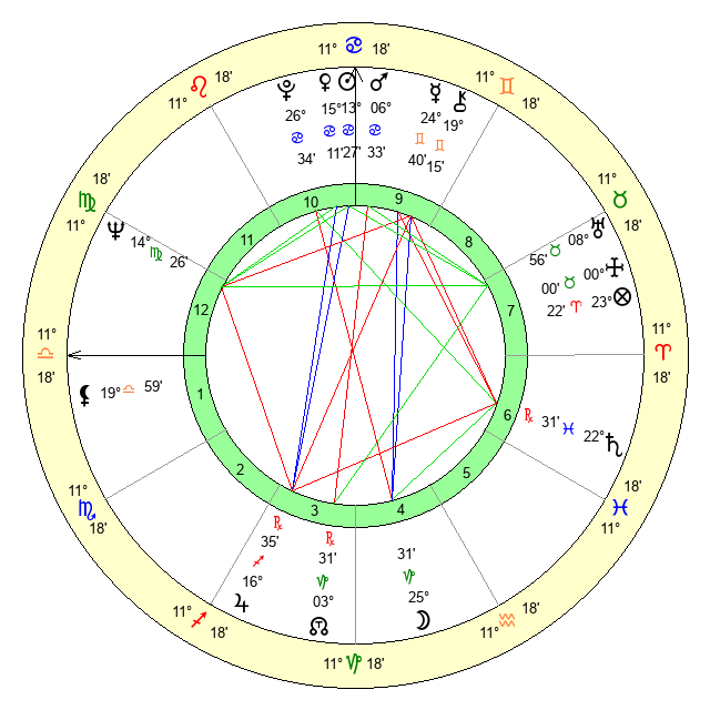 | Venus | 15 Cancer 12 | 1 Gemini 10 | 4 Scorpio 50 |