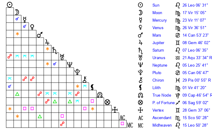 | Neptune | 5 Leo 26 | 1 Aries 38 | 6 Leo 56 |