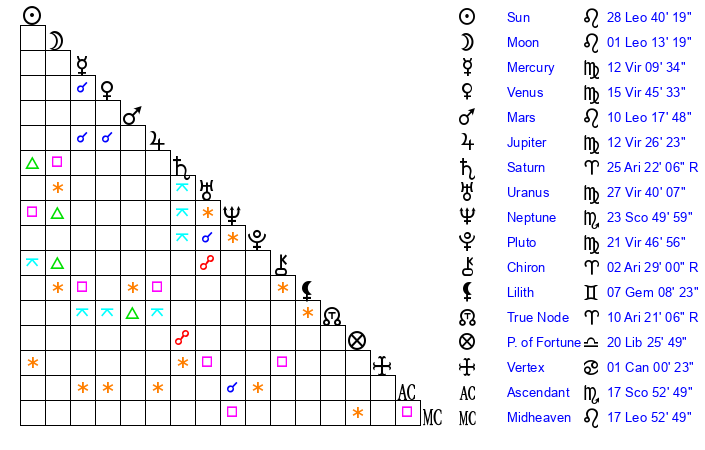 Moon | 1 Leo 14 | 9 Leo 47 | 29 Leo 58 |