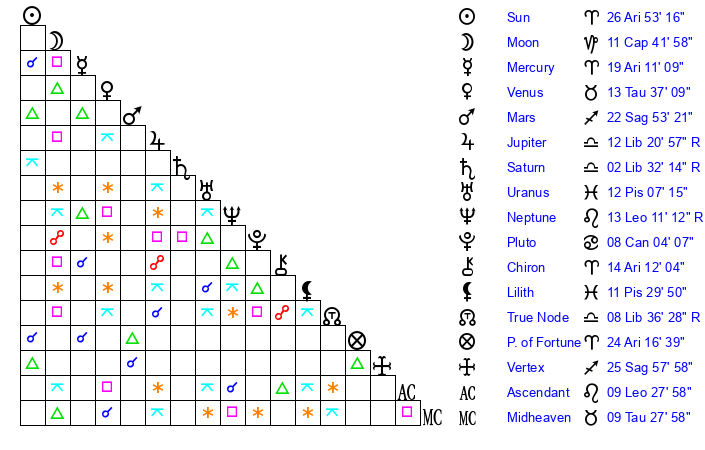 | Sun | 26 Aries 53 | 27 Aries 56 | 5 Leo 46 |