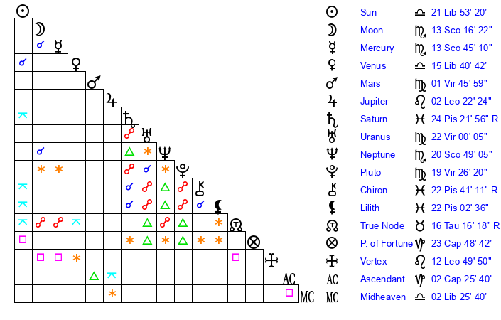 Sun | 21 Libra 53 | 22 Libra 50 | 20 Sagittarius 14 |