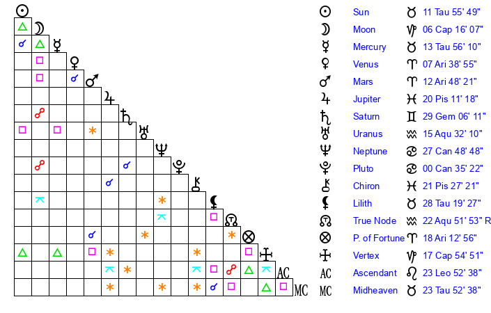 | Uranus | 15 Aquarius 29 | 26 Taurus 28 | 13 Aquarius 5 |