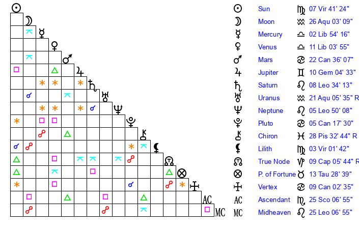 | Sun | 7 Virgo 41 | 8 Virgo 32 | 25 Sagittarius 12 |