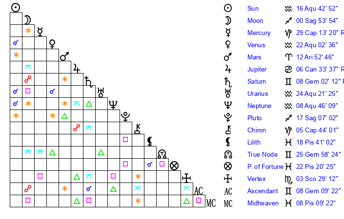Sun | 16 Aquarius 43 | 17 Aquarius 9 | 9 Pisces 56 |