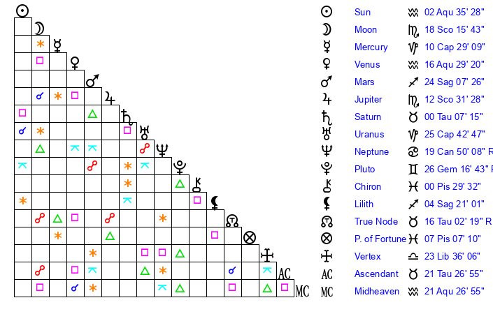 Sun | 2 Aquarius 36 | 3 Aquarius 57 | 25 Taurus 40 |