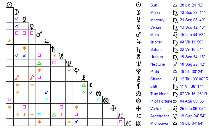 Sun | 28 Libra 24 | 29 Libra 30 | 13 Sagittarius 41 |