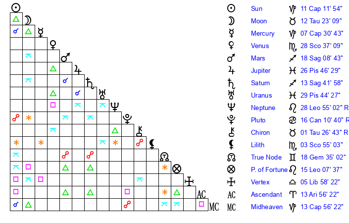 | Moon | 12 Taurus 33 | 18 Aquarius 48 | 28 Scorpio 46 |
