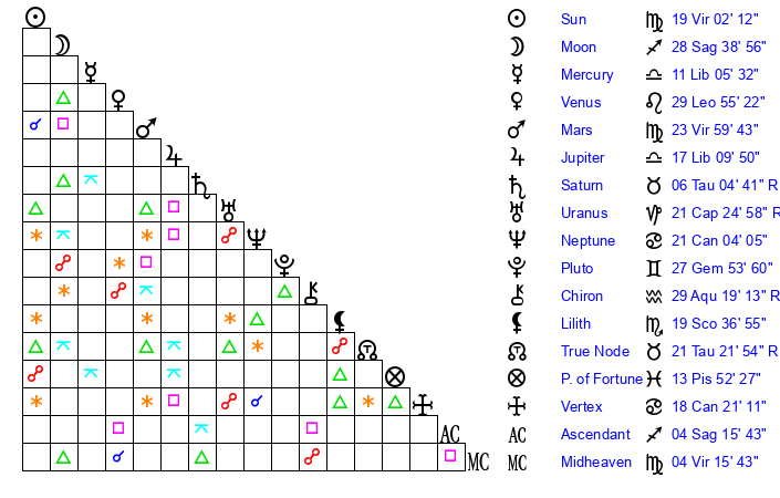 | Moon | 28 Sagittarius 37 | 27 Taurus 2 | 12 Pisces 35 |