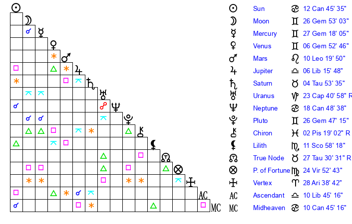 | Sun | 12 Cancer 46 | 13 Cancer 55 | 4 Scorpio 24 |