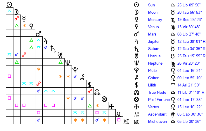 | Moon | 21 Taurus 0 | 24 Virgo 15 | 29 Gemini 40 |