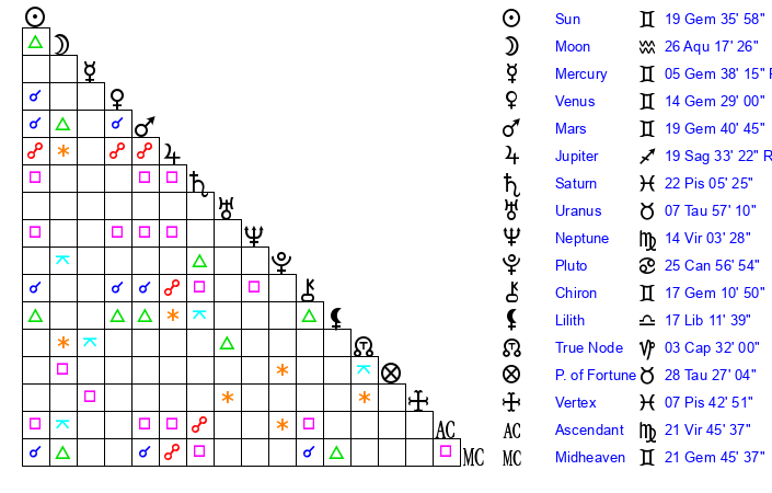 | Moon | 26 Aquarius 15 | 13 Sagittarius 11 | 9 Gemini 16 |