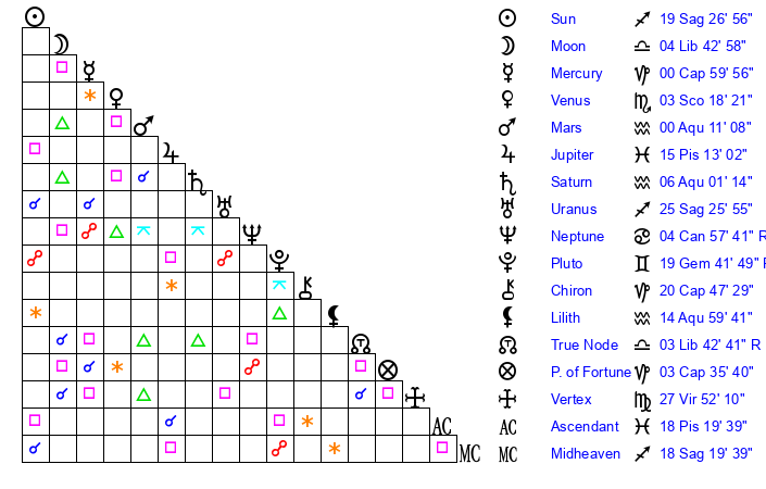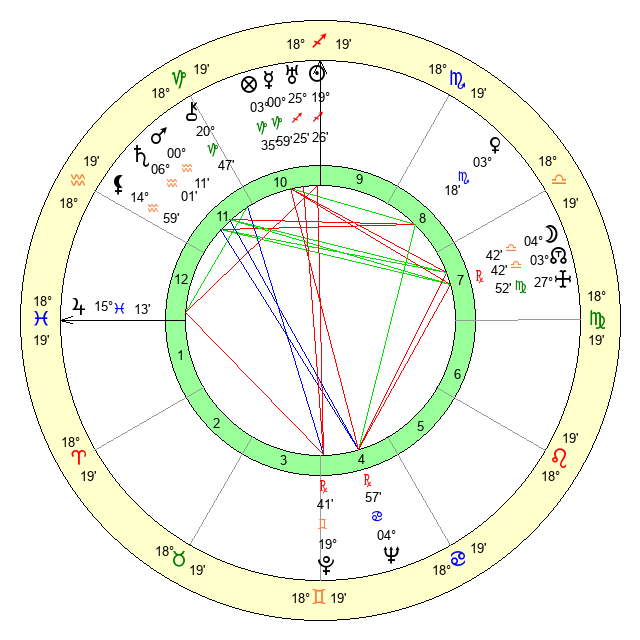 | Moon | 4 Libra 38 | 29 Virgo 46 | 15 Pisces 46 |