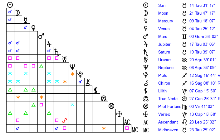 Sun | 14 Taurus 31 | 14 Taurus 29 | 8 Gemini 37 |