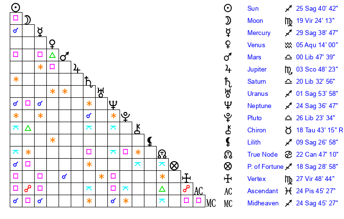 | Sun | 25 Sagittarius 41 | 26 Sagittarius 0 | 10 Aquarius 29 |