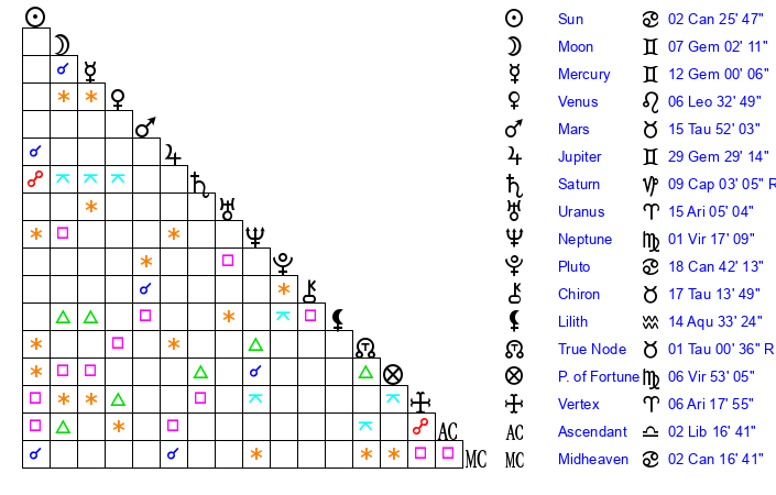 | Mercury | 12 Gemini 0 | 27 Cancer 10 | 22 Virgo 59 |