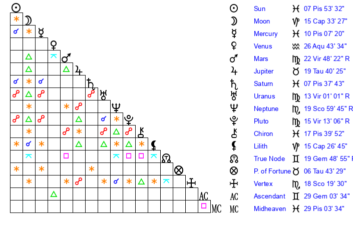 Pluto | 15 Virgo 13 | 2 Aquarius 49 | 13 Virgo 52 |