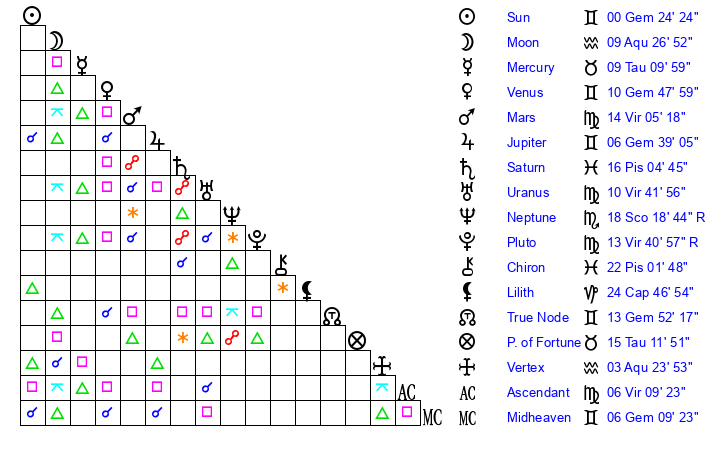 Sun | 0 Gemini 25 | 0 Gemini 53 | 27 Cancer 45 |